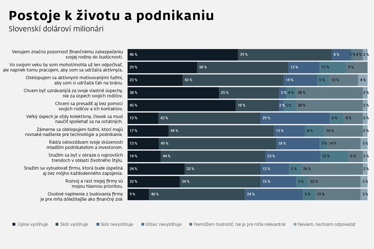 Celkovo tieto hodnoty naznačujú, že slovenskí a českí milionári, aj napriek tomu, že si už môžu užívať komfortný život, stále kladú dôraz na aktívny prístup, samostatnosť, vzájomnú spoluprácu a neustály rozvoj ako základné piliere, ktoré formujú ich úspech a naplnenie v osobnom i profesionálnom živote. Úspech pre nich nie je koncová čiara, ale neustála cesta – s rodinou, tímom a jasnou víziou budúcnosti.